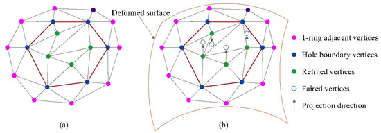 Until now, it is obvious that the minimization problem for the 1D case actually is to solve for the Bi-Laplacian. Therefore, the same mechanism can be applied to the minimization of Equation (2), but it requires using more boundary constraints. Finally, the continuous formulation can be transferred to discrete triangle meshes by replacing the continuous coordinate with the vertex coordinate , and then a deformed mesh can be produced by using the Laplace-Beltrami operator. Figure 8 shows an example of how to deform a refined patch. First, both the 1-ring adjacent vertices of the hole and the refined vertices are utilized to fit a deformed surface, then the refined vertices are projected onto this surface based on the constraints (1-ring adjacent and hole boundary vertices) so that the 3D coordinates of all refined vertices are updated. Finally, all refined vertices are relocated on the deformed surface, which makes the refined patch assort with the surrounding mesh well.