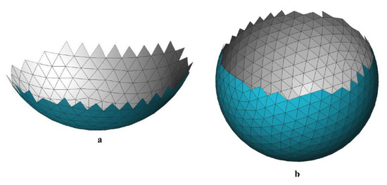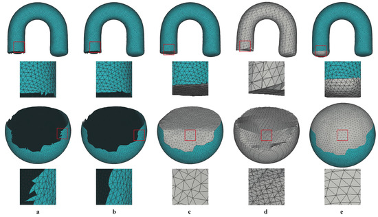 Figure 13 shows the hole-filling results on two mechanical models. The results shown in Figure 13c–e are obtained by the algorithms of Liepa [6], Polymender [32], and our method respectively. Table 1 gives the statistics of the quantitative evaluation results. Figure 13c demonstrates that Liepa’s algorithm has the ability to close the holes of the tube and sphere models, but it fails to recover the geometry shapes of the missing regions. The reason is that the Liepa’s algorithm is usually taken as an initial filling technique to roughly close the holes in a simple way. Regarding the Polymender, it falls into the category of voxel-based methods, so the whole models have been modified when performing the hole-filling operation. From the results shown in Figure 13d, it is obvious that the produced results are not satisfactory since many non-hole regions have also been modified. Besides, a large number of degenerated triangles are contained in the resulting models. In contrast, the results obtained by our method (as illustrated in Figure 13e) not only can make the shapes of the filling patches assort with their surrounding meshes but also can ensure that most of the newly added triangles and vertices are both highly regular. Although all three algorithms can produce completed models, the results obtained by our method are obviously better than others. From the view of model shape, out method has the ability to make the filling patch assort with the surrounding mesh well.