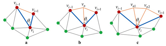 Then, in order to obtain the optimal vertex , an initial insertion edge should be first calculated. As shown in Figure 10a, should locate on the bisector of the angle , and its length can be determined by simply averaging the length of and via the formula below.