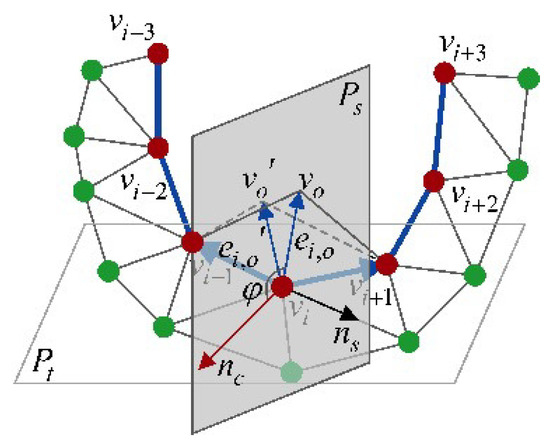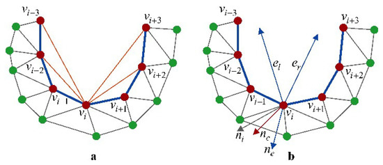 First, the curvature of the vertex is computed. Due to the good linear characteristics of the Taubin curvature [38] in time and space, we choose it to directly calculate the vertex curvature of and . As mentioned above, the neighboring vertices of should be considered, therefore, the Taubin curvature of is determined by averaging the Taubin curvature of and instead of direct calculation via the formula below: