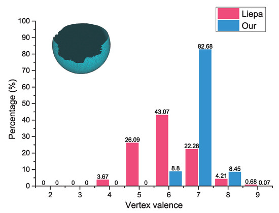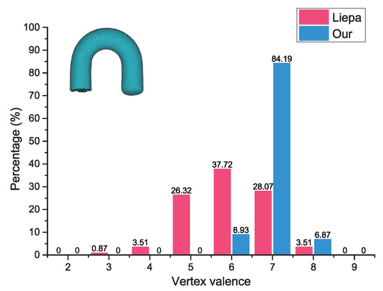 Before analysing Table 1, Figure 14 and Figure 15, two notations are defined: triangle quality factor and vertex valence . Given a triangle, the ratio of its shortest edge to the radius of its circumscribed circle is denoted as the triangle quality factor . If a triangle is closer to be a regular one, the closer is to 1.73. In this work, the triangles whose is greater than 1.39 will be regarded as high-quality ones, and then their percentage in the total number of the filling triangles will be computed. For one vertex, the number of its one-ring adjacent triangles is defined as its vertex valence . As one highly regular triangular mesh, the of most vertices is six. From Table 1, it can be observed that the hole-filling times for closing the sphere model by our method is almost one-fifth of that of Liepa’s method (19 VS 102.73 ), and one-eighth of that of Polymender’s method (19 VS 158 ). The main reason for the efficient performance of our method is the refined vertex normals can enable the newly added vertices to close the hole in a very fast and proper way. Besides, both the regularity of the inserted triangles and vertex value are guaranteed during the closing stage without needing any further postprocessing steps, which can efficiently reduce the filling times. These results indicate that our method is very fast especially for handling large-sized holes. On the other hand, the evaluation results show that the quality level of the filling patches obtained by our method is almost twice as high as that by the other two methods, which can effectively demonstrate that our method can produce high-regularity filling patches, i.e., containing more regular triangles. Figure 14 shows the comparison results about vertex valence computation between ours and Liepa’s algorithm on the tube model. From the visualization view, it can be seen that most of the vertices inside the filling patch obtained by our method have the vertex valence to six (84%). However, the Liepa’s algorithm generates a few vertices with the vertex valence of three, which may cause degenerated triangle defects. Furthermore, Figure 15 shows that our method can ensure that the majority of the filling vertices have vertex valence of six (82.68%).