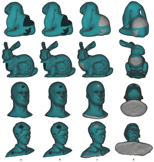 - Ngo, H.T.M.; Lee, W.S. Feature-first hole filling strategy for 3D meshes. In International Conference on Computer Vision, Imaging and Computer Graphics; Springer: Berlin/Heidelberg, Germany, 2011; pp. 53–68. [Google Scholar]