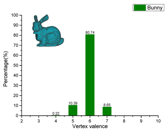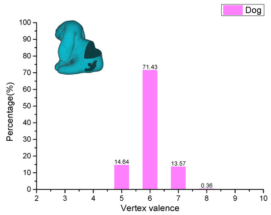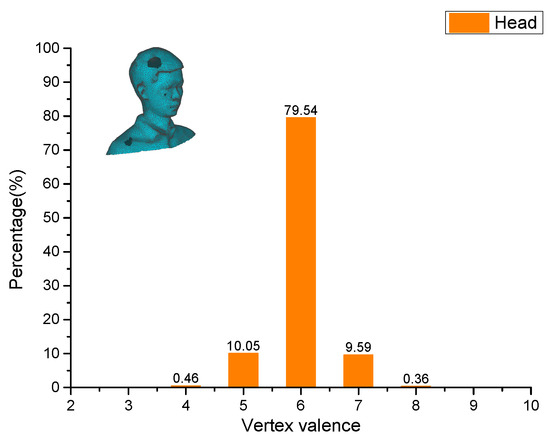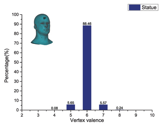 To further demonstrate the efficiency, robustness and shape-recovery ability of our method, four non-mechanical models were tested. For each model, it contains at least one of the three types of holes with different sizes, and then our algorithm is applied to fill them. Figure 16 shows a hole-filling gallery on these four models. Figure 16a illustrates the incomplete models, and it can be seen that most of them suffer from at least one or more types of holes, e.g., small-sized, middle-sized, and large-sized holes. In particular, the ones contained in the statue and head models are divergent holes. The cleaned meshes are shown in Figure 16b, and from the results, it can be observed that all the tooth faces occurring on the hole boundaries have been completely removed, which provides smooth inputs for the next processing step. The final filling results obtained by our method are illustrated in Figure 16c,d. From the viewpoint of visualization check, all the holes have been successfully closed by our method, besides, it can also ensure the filling patches to be compatible with surrounding meshes well. Table 2 gives the statistics of the hole-filling results obtained by our method on these four models. Regarding the head model, although it contains a large and divergent hole with a boundary vertex size of 160, our algorithm takes only 91.83 to close it. Unlike the Liepa’s algorithm, the closing and refining stages for a large hole are completed in a single step for our method, which can significantly reduce the hole filling times, especially for large ones. Compared with the Polymender’s algorithm, our method strictly limits the processing region to its adjacent area of one large hole, which can prevent the non-hole regions from being modified. From the ninth column of Table 2, it can be seen that the triangle quality evaluation results on all testing models are greater than 76%, which proves that the filling patch generated by our method is mainly composed of regular triangles. Furthermore, Figure 17, Figure 18, Figure 19 and Figure 20 present the statistics of the vertex valence computation results obtained by our method on these models. From these results, it can be seen that the vertex valence of the filling vertices obtained by our method only ranges from four to eight, and the vertices with vertex valence of six account for more than 71 % of the total number of the newly inserted vertices. These results demonstrate that our method can guarantee the majority of the newly added vertices to be high regular ones.