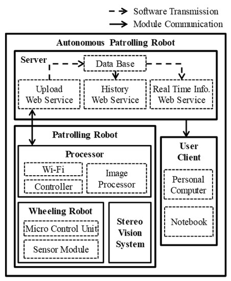 The three basic components of the system include a patrol robot, server, and client, as shown in Figure 1. The system architecture of each component is outlined in the following.