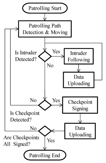 The robot first searches for a passable path using depth information from the SVS. While on patrol, the robot follows any detected intruder, takes an image of the individual, and uploads the images in real-time. The robot approaches all detected inspection points and signs in electronically, whereupon the inspection point number and sign-in time are uploaded. When all of the inspection points have been passed, that particular patrolling task is complete. Figure 3 presents a flowchart showing the process of autonomously patrolling a site. In the following section, we introduce the four functions controlled by the proposed algorithm.