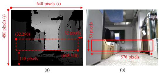 In order to make the patrol path random, depth information of the image is analyzed for searching possible patrol paths in this research, instead of using existing path planning. In addition, to reduce the computation required for processing information in the identification of a suitable path, a region of interest (ROI) is defined from the following image coordinates (pixel number): (32,290) to (608,340), as shown in Figure 5a. The ROI is chosen based on the height where the SVS is installed and the width of the robot. Figure 5b presents a corresponding color image with ROI. Assume that and are the horizontal and vertical coordinates on the ROI image plane, where and . In order to find a possible path region in ROI, the minimum depth at each column of ROI is selected as at first. The size thresholds of a path are defined as follows: depth (1500 mm) and width (3520 mm). In the following, four steps of suitable path identification are described: