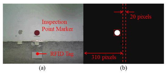 (a) An inspection point marker with radio frequency identification (RFID) tag and (b) the corresponding binarized results from SVS.