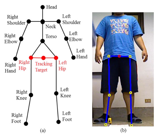 When an intruder appears in the FOV of the SVS, the skeleton of the individual is analyzed to identify its feature. The functions of the openNI library is used for skeleton detection, and the identified feature is composed of joints and limb links, as shown in Figure 7a. Given the height of the intruder is about 170 cm, then the proposed distance between the intruder and the robot (or the SVS) for detection is 2500 mm to 3000 mm. In this range, the full body of the intruder can be viewed in the field of view (FOV) of SVS for skeleton analysis without being too close or too far. In order to track the intruder, the center between left and right hip nodes is used to estimate the orientation and the distance between the robot and the intruder. Assume that the image coordinate in horizontal and depth of the left and right hip nodes are and , respectively. Thus, the tracking target of the intruder and its distance are defined as and . The detection results are presented in Figure 7b. In addition, while an intruder is detected, the function of the robot is changed from patrolling to tracking until the intruder disappears from the FOV of SVS.