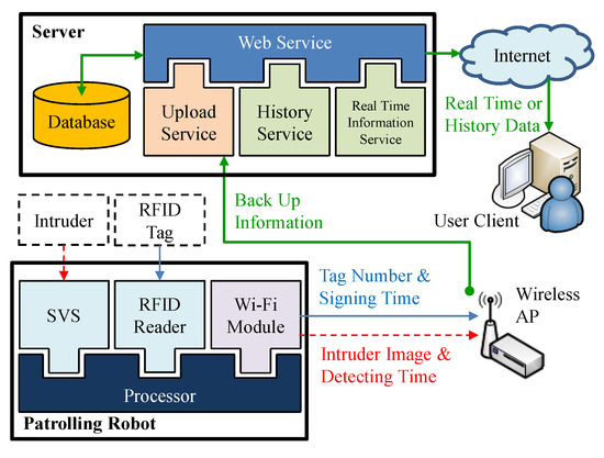 Finally, besides functions of SLAM for patrolling, the system outlined by Hung et al. [31] is used in our research for the backing up of patrolling data and making internet queries. Though web service is not the latest technology, it remains useful for regional network communication. To reduce data transmission, Lian et al. propose an embedded spatial coding method, which assigns weights to objects of interest [32]. In this study, images of intruders are encoded and then transmitted for backing up.