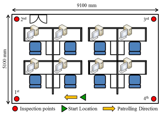 An environment based on the proposed functions was created to verify the efficacy of the proposed algorithm. The environment was a 9100 mm x 5100 mm square space with several pieces of office furniture located in the center, and inspection points were set in each corner of the room, as shown in Figure 9. At the beginning of the experiment, the robot was placed along a wall. Patrolling began when a user pressed the start button on the robot’s HMI. The sequence of the patrol task is outlined in the following.