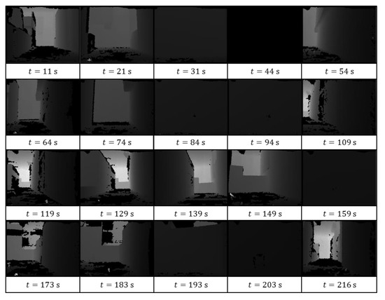 - After signing in, the robot rotated CCW to search for a suitable path, whereupon the depth values increased considerably from the left side to the right side from 44 s to 64 s. This is similar to the records from 94 s to 119 s, 159 s to 173 s, and 193 s to 216 s.