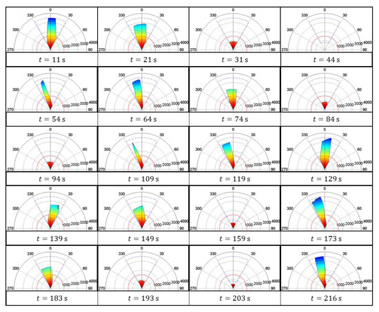 The depth information of the ROI was also recorded to analyze the trajectory of the robot while on patrol. In order to fix the distortion caused by size-changing of FOV in different distance from SVS, the recorded data is transformed by Equation (2) and presented in the form of polar space, as shown in Figure 12. The FOV is depicted with a blue dashed line, and the threshold of depth is shown with a red dashed line. In addition, the color scale is used to present the values of each in . The analysis results are listed in the following: