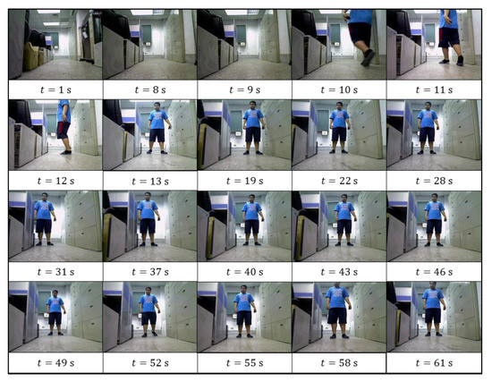 Several other experiments were conducted to verify the efficacy of the intruder detection function. Figure 13 presents recorded images of the intruder in one of the experiments. While the robot was executing its patrol task, an intruder suddenly ran into the FOV of the SVS (at 10 s), whereupon the SVS detected the skeleton of the intruder (at 13 s). The robot simultaneously ceased its patrol task and initiated the intruder tracking task. From 19 s to 43 s, the intruder was pacing around, during which time the robot rotated to keep the intruder within the center region of the image plane. As the intruder was walking backward (from 43 s to 49 s), the robot followed in order to maintain the depth value of tracking target between the near-threshold value and far threshold value . In this experiment, the robot proved highly effective in using the proposed algorithm to detect, identify, and track the intruder. Finally, the recorded images can be queried from a database by the graphic user interface (GUI) built in the user client.