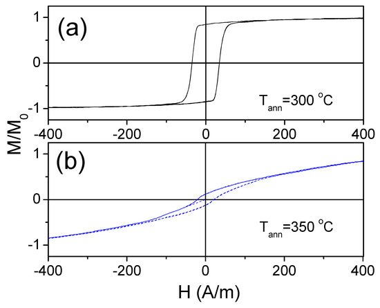Hysteresis loops of stress-annealed at Tann = 300 °C (a) and Tann = 350 °C for σa = 190 MPa (b) Fe75B9Si12C4 microwires.