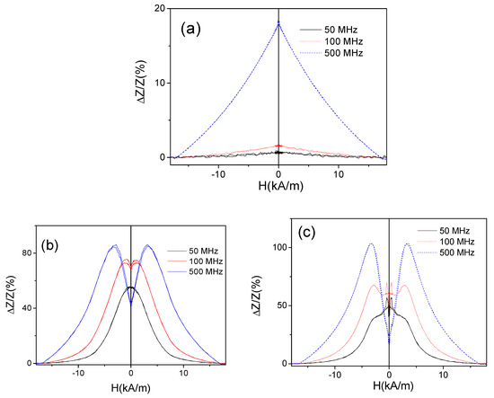 We measured the impedance, Z, and its magnetic field dependence over a wide range of frequencies (10–900 MHz), using a vector network analyzer. As-prepared and stress-annealed samples were placed in a micro-strip sample holder, and impedance was obtained from the reflection coefficient S11, as described elsewhere [42]. From Z-values obtained for different magnetic fields, H, we evaluated the magnetic field dependences of the GMI ratio, ΔZ/Z, which is defined as follows: