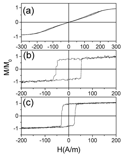 Hysteresis loops of as-prepared and stress-annealed samples were measured by the flux metric methods described elsewhere [12,38]. For a better comparison of samples annealed under different conditions, we represent the hysteresis loops as the normalized magnetization, M/M0 versus the applied magnetic field, H, where Ms is the magnetic moment at the maximum amplitude of magnetic fields, Hmax.
