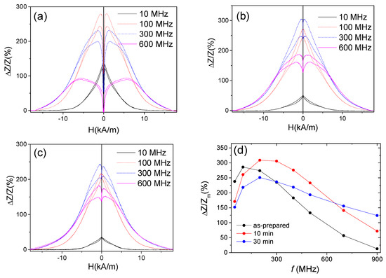 As expected, as-prepared the Co69.2Fe4.1B11.8Si13.8C1.1 microwire displays an enhanced GMI effect, as shown in Figure 7a (GMI ratio up to 285%), with a double-peak magnetic-field dependence. Such ΔZ/Z (H) dependencies are ascribed to a circular magnetic anisotropy with high initial permeability and low coercivity typical for Co-rich microwires with vanishing and negative λs values [43,44]. Upon stress-annealing at a fixed Tann = 300 °C /σa = 80 MPa and different annealing time, a noticeable modification of the ΔZ/Z (H) dependencies, either for 10 min (Figure 7b) or 30 min (Figure 7c), has been observed. The maximum GMI ratio, ΔZ/Zm, at f = 100 MHz decreased from 280% to 265% and 250% for samples stress-annealed at 10 and 30 min, respectively. However, stress-annealed samples present higher ΔZ/Zm values at high frequency region (Figure 7b–d). Both stress-annealed samples exhibited maximum on ΔZ/Zm (f) dependence, at about 200 MHz, as can be appreciated from Figure 7d. For annealing time, tann = 10 min, ΔZ/Zm ≈ 310% was achieved (Figure 7b,d). Furthermore, at a lower frequency (10 MHz) the ΔZ/Z (H) dependence showed a single peak character associated with an axial anisotropy induced upon stress-annealing. Observed frequency dependence on ΔZ/Z (H) can be attributed to the radial distribution of magnetic anisotropies in the core–shell domain structure [46,47,48]. Consequently, stress-annealing of Co-rich microwires resulted in an increase in the GMI ratio, at frequencies above 400 MHz, as can be observed in Figure 7d.