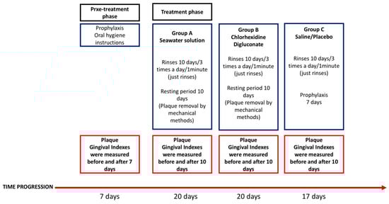 Many bacteria present in the mouth cannot be eliminated properly with daily brushing, and can be present in the preservation of healthy dental and periodontal tissues []. Gingivitis begins with plaque build-up, which will end in periodontitis []. In this context, much research has investigated the efficacy of several types of mouthwash, which are designed to improve plaque and gingivitis levels. V-Sol containing alcohol, as well as essential oils (E.O.), have been shown to offer beneficial effects on plaque and gingivitis index, where it seems to significantly improve oral health six months after use [,]. Different mouthwashes containing natural compounds (NCCM) versus E.O. mouthwash (Listerine®) demonstrated their effectiveness for plaque control [,]. Another study evaluated the effects of E.O. that reduces plaque and gingivitis compared to cetylpyridinium chloride (CPC) and a placebo. Essential oils showed a better effect than mechanical plaque control (MPC) and CPC, reducing plaque and gingival inflammation in patients who may suffer gingivitis. Therefore, mouthwashes containing E.O. should be the first option for mechanical plaque control [,,]. The therapeutic application of natural compounds showed that these compounds have some efficacy in the fight against gingivitis and periodontitis [,,,,]. However, evidence that the efficiency and effectiveness of NCCM, as routine methods that help mechanical oral hygiene practices for plaque control and gingivitis has remained low, and it seems that some NCCMs may offer various oral health benefits by reducing the plaque and gingivitis []. The main side effects of alcohol-containing mouthwashes (ACM) were oral pain, burning sensation, and taste disturbances [,,,]. When the clinical efficacy of two 0.2% chlorhexidine mouthwash (CHX) formulations are compared, the alcohol-free chlorhexidine rinse demonstrated action levels similar to the use of frequently used alcohol-formed rinses []. Some of the most frequent side effects from the use of CHX are staining of the tongue and teeth, as well as taste alteration, as CHX is a rinse that is very effective in reducing plaque and gingivitis. Some authors describe moderate evidence when oxygenating agent (OA) and CHX work together to reduce teeth staining, without interfering with the inhibition of plaque growth [,]. Mouthwashes with seawater could offer a promising alternative for CHX to overcome its possible adverse effects. Balneotherapy with spa water or the Dead Sea water can be used to treat inflammatory skin diseases (psoriasis and atopic dermatitis). This effect of seawater has been attributed to the preservation of the skin barrier induced by NaCl and KCl []. Only one study has investigated the use of a mouthwash solution with sea salt in street children in Manila, demonstrating its effectiveness in reducing mild to severe forms of periodontal disease. The authors proposed sea salt mouthwash for its antimicrobial action, which is highly effective and well-tolerated by the user and could be implemented worldwide using low-cost resources []. This is considered to be the first pilot study t which compares the clinical efficacy of 0.2% chlorhexidine with a new mouthwash formulated with seawater (analyzed for the first time) and a saline solution, in reducing gingiva inflammation and plaque formation.