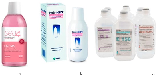 The mouth rinses used in the study: (a) Bottle A (Sea4), (b) Bottle B (PerioKin CHX 0.20%), and (c) Bottle C (saline).