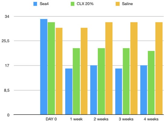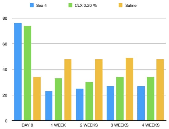 The periodontal status of all subjects was evaluated at the time of recruitment. Probing depth was controlled ranged between 1.3 and 3.1 mm, while plaque indexes ranged between 0.1 and 1.2 mm. All subjects (N = 21; SEA 4 Group N = 7; Chlorhexidine Group N = 7; Saline water Group N = 7) complied with the experimental protocol, and the data obtained was complete. The amounts of the products returned in the patient´s bottles when the study was finished suggested the right level of subject uses with the study protocol. No side effects were reported during the study.