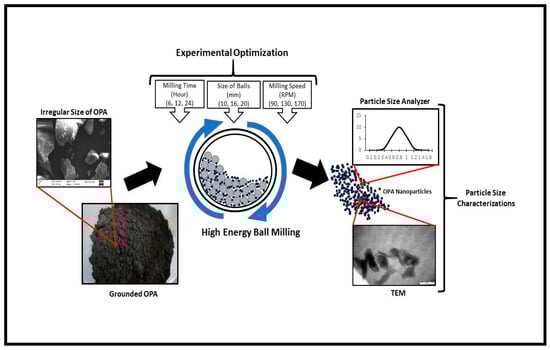 In order to obtain high-quality POA with fine particle size, homogenous size distribution, and unique morphology, various preparation techniques have been used to synthesize ultrafine POA, including ball milling and grinding technique [,]. There has been an abundance of investigation dedicated to the production and characterization of nanoparticles due to their distinct characteristics, which are unavailable in conventional macroscopic materials. The mechanical ball milling technique is one of the well-known as a simple and low-cost method for the production of nano-structured materials []. This technique has proved to be an effective way to fracture and reduce the size of particles with the possibility of obtaining large quantities of nanomaterials. The process inside the ball mill involved mechanical energy transfer between the balls and the substrate was assured by continuous impact [,].