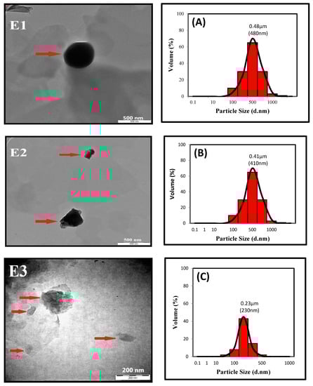 TEM image (E1–E3) and POA nanoparticle distribution (A–C) from experiment one, two, and three of the Taguchi optimization processes.
