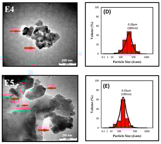 The TEM images of the POA nanoparticles obtained in nine experiments (Table 2) are shown from Figure 3, Figure 4 and Figure 5. The particle size distribution histogram Figure 3A–C and TEM image of POA nanoparticles from experiment one to three (E1–E3) are shown in Figure 3. The TEM images only reveal the lateral dimension of the nanoparticle but no information on the nanoparticle height. Though, with the dimension of the width particles from the TEM images, the lateral particle size distribution can be obtained []. From the histogram, the size distribution is narrow, and the major peak is centered at 480, 410, and 230 nm. The TEM image of experiment one (E1) illustrated the identical of the POA shape which is spherical. However, The TEM image significantly reveals that the smaller the particle size distribution, POA tends to agglomerate, and identification of particle shape and size becomes more complicated.