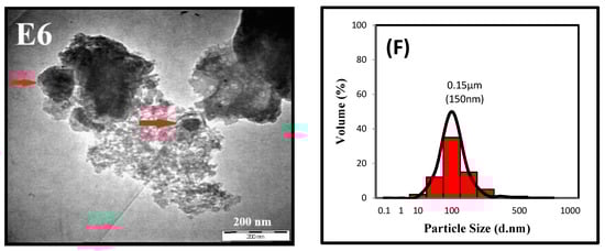 TEM image (E4–E6) and POA nanoparticle distribution (D–F) from the experiment four, five, and six of the Taguchi optimization processes.