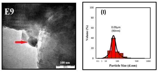 TEM image (E7–E9) and POA nanoparticle distribution (H–I) from experiments seven, eight, and nine of the Taguchi optimization processes.