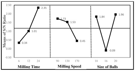 The S/N response table by factor level for the milling time, milling speed, and size of balls was created in an integrated way and the results are tabulated in Table 4. The delta (∆) value was calculated using (highest S/N–lowest S/N) for each parameter and compared. From the point of the “smaller is better” quality characteristic, the size of the ball’s performance showed the larger delta (∆) value compared to other parameters. This is evidence that the size of balls showed the greatest influential parameter in the ball milling process followed by milling time and milling speed. The greater delta (∆) values for a parameter, the effect of the parameter on the process will correspond to a smaller variance of the output and generate better performance of the experiment [,]. Therefore, the size of the ball’s performance was the most significant parameter for producing POA nanoparticles.