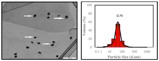 The particle size distribution of the POA nanoparticles under predicted optimal condition from the Taguchi method was illustrated in the histogram graph in Figure 7. A study by Akbari and Tavandashti [] proposed that to obtain reliable and valid frequency versus particle size curve, hundreds of particles should be measured for an optimum sample size. The histogram graph for particle size distribution shows the intensity or frequency versus the size range typically. It was observed that the majority of the POA particle size distributed between 70–110 nm of particle sizes. From the histogram profile, the average diameter of the POA nanoparticles was estimated to be 80 nm. The smallest particles were obtained with the lowest intensity and were estimated to be eight (8) nm. Meanwhile, the largest particles exhibited at 0.2% intensity were estimated to be 200 nm. Although the histogram reveals the POA nanoparticle’s distribution, the information is still inadequate to characterize the behaviour of the POA nanoparticles. Moreover, the distribution of the POA nanoparticles probably influences by the agglomeration resulting in variation of POA nanoparticles sizes. This behaviour occurred because of the robust and attractive interaction between nanoparticles derived from strong Van Der Waals force. A recent study by Aqeel Ashraf and Peng [] revealed that a high concentration of nanoparticles with extraordinary surface area commonly aggregated more rapidly, hence formed larger nanoparticles. Therefore, the preparation of POA nanoparticles mainly depends on the optimal parameters that could increase the number of nanoparticles and significantly decrease the agglomeration of nanoparticles. Thus, transmission electron microscope will be used to view the image of POA nanoparticles individually.
