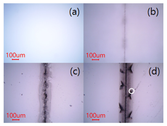 Result of damage threshold test for the soda-lime glass substrate. Laser power: (a) 0.33 W, (b) 0.72 W, (c) 1.22 W, and (d) 1.76 W. The circle in the figure denotes a crack.