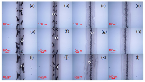 Optical images of the glass surface damaged by a single laser scan. Laser power: (a–d) 2.28 W, (e–h) 2.8 W, and (i–l) 3.32 W. Scan speed: (a,e,i) 5 mm/s; (b), (f,j) 15 mm/s; (c,g,k) 25 mm/s; and (d,h), and (l) 35 mm/s. The circle in the figure denotes a crack.