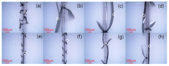 Optical images of the glass surface damaged by a single laser scan with a higher pulse repetition rate. Scan speed: (a–d) 5 mm/s and (e–h) 15 mm/s. Laser power and pulse repetition rate: (a,e) 2.48 W and 50 kHz, (b,f) 2.65 W and 60 kHz, (c,g) 2.39 W and 70 kHz and (d,h) 2.12 W and 80 kHz. The circle in the figure denotes a crack.