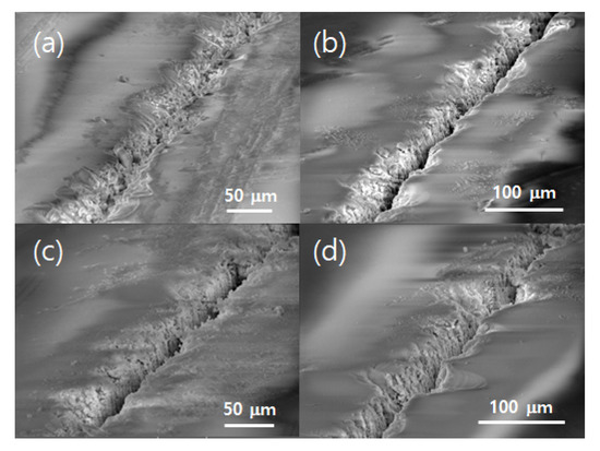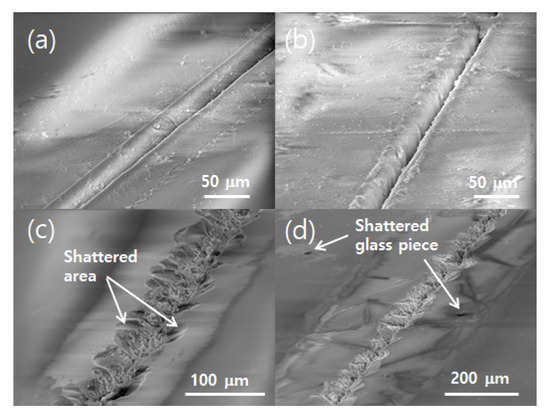 SEM images of the glass surface damaged by single laser scan. Laser power: (a,c) 2.28 W and (b,d) 2.8 W. Scan speed: (a,b) 15 mm/s and (c,d) 35 mm/s.