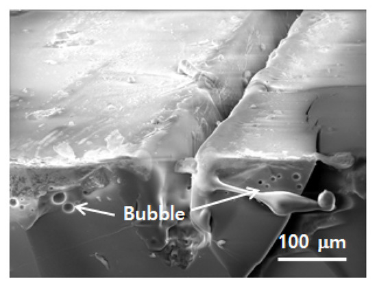 In the high power density laser–matter interaction, physical phenomena such as melting, vaporization, and plasma formation are involved, and material removal is mostly achieved through vaporization and melt ejection driven by high vapor pressure [24,25]. According to Figure 7a,b, it is seen that molten materials removed from the irradiation regions splash out on the surface near grooves. This indicates that melting is the dominant material removal mechanism. At a relatively high scanning speed (see Figure 7c,d), many molten glass powders not ejected are observed inside the groove owing to less laser energy deposition on the glass surface, which in turn makes a rough surface morphology at the irradiation zone. Under a relatively high scanning speed, the shattering of the surface is also seen at the edge region of the groove. This is attributable to the shock wave induced by plasma breakdown during the process. The sharp and non-melt glass pieces found around the groove in Figure 7d are the outcome of shattering. Therefore, in this case, high temperature vaporization inducing the shock wave as well as the melting contributes to material removal. The generation of micron bubbles is seen in HAZ (see Figure 8). During the interaction between the laser beam and glass, thermal energy inside the glass could induce thermal dissociation and other chemical reactions of the components shown in Table 3. This may generate the oxygen gas to be the source of the bubbles inside the glass.
