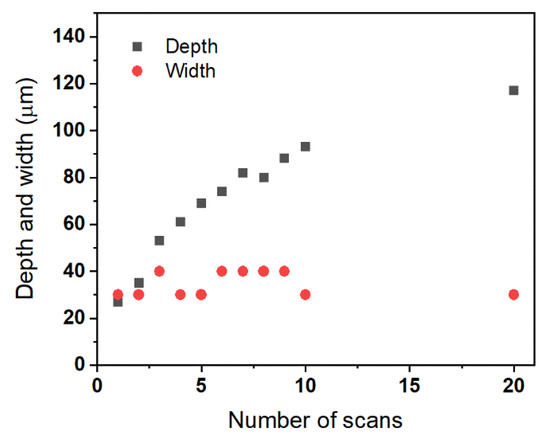 Figure 10 shows the measured depth and width of the groove as a function of the number of scans. The optical images (cross sectional view of the grooves) used to measure the depth and width of the groove are shown in Figure 11. The width of the groove does not nearly change as the scan number increases, whereas the depth of the groove tends to increase with the scan number, as seen in the figure. In high power density laser–material interaction, the absorption of the laser beam in the material dramatically increases once a laser-induced crater is produced as a result of the multiple reflection of the laser beam in the crater [24]. This could help the material removal in multiple laser scans, although the intensity of the laser beam decreases owing to continuous beam defocusing with the depth of the groove.