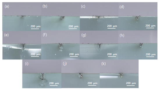 Optical images of the grooves (cross-sectional view) produced by multiple laser scans with a zero scan spacing (laser power: 2.28 W, scan speed: 25 mm/s, and pulse repetition rate: 30 kHz). Number of scans: (a) 1, (b) 2, (c) 3, (d) 4, (e) 5, (f) 6, (g) 7, (h) 8, (i) 9, (j) 10, and (k) 20.