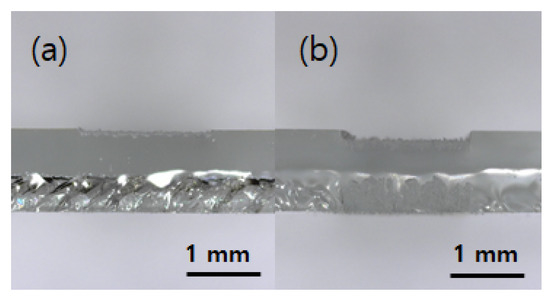 Cross section of the grooves produced by multiple laser scans with a non-zero scan spacing (laser power: 2.28 W, scan speed: 25 mm/s, pulse repetition rate: 30 kHz, and scan spacing: 30 μm). Scanning scheme: (a) method 2 in Figure 2 and (b) method 3 in Figure 2 (number of scans per scan track: 5 and number of scan tracks: 130).