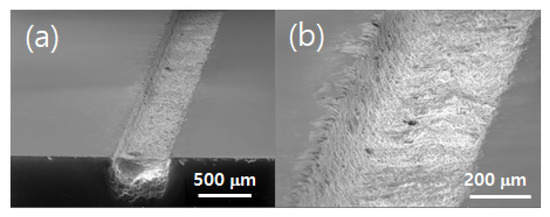 SEM image of the groove produced by multiple laser scans (number of scans per scan track: 5 and number of scan tracks: 17) using method 3 (laser power: 2.28 W, scan speed: 25 mm/s, pulse repetition rate: 30 kHz, and scan spacing: 30 μm). (a) Low magnification and (b) high magnification.