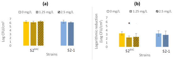 The susceptibility of biofilms formed under different BAC sub-inhibitory concentrations was determined by logarithmic reduction (the difference between Log CFU/cm2 values of cellular enumeration—biofilm formation—and the corresponding Log CFU/cm2 values obtained after exposure to BAC, equaling 1280 mg/L, 5 min). For strain S2-1, the presence of sub-inhibitory concentrations of BAC did not have a significant effect on biofilm susceptibility (p > 0.05). However, for the BAC-R strain S2BAC, the presence of a sub-inhibitory concentration of BAC (1.25 mg/L) resulted in higher resistance of the biofilm (p < 0.05) (Figure 1b).