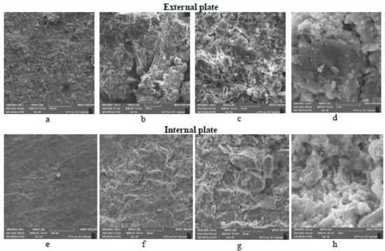 In addition to the corrosive substances found in chicken coop, concrete structures which come into contact with chicken coop corrode due to regular cleaning with disinfectants which are made of corrosion inducing agents such as hydrogen peroxide (H2O2), formalin, peroxyacetic acid, soda ash, slaked lime, iodine monochloride, glutaric aldehyde, neutral calcium hypochlorite, lime chloride, and caustic soda [6]. The cumulative effect was a 10% loss in the strength of the concrete and irreparable damage to the microstructure, as illustrated in the SEM images in Figure 1; the damage extended to both the upper and the lower layers. Figure 1a–h illustrate virgin structures and the microscopic changes defined by agglomerates from the products of hydration and the formation of crystals of calcite and final disintegration.