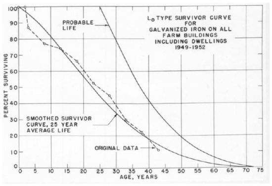 Steel is regarded as an alternative or complementary material to concrete. The factors that inform the selection of the material include the fact that it is less susceptible to corrosion and attack by acid, alkali, and other chemicals, as noted in the preceding section [2,7]. Steel is also resistant to attack by bacteria [8], and structures made of steel can be alloyed to form, nickel, chromium, and other forms of steel. Steel is also the material of choice in the construction of roofing materials for agricultural buildings [9]. Steel roofs are preferred because they are waterproof—a necessary requirement for long-lasting structures. The durability of steel structures can also be reinforced by hot-dipping or galvanizing. The treatment process for steel facilitates the formation of a robust bond between zinc atoms (on the surface) and the steel material. In addition, the treatment of steel ensures that the structure is covered with a uniform layer of base material to offer protection against the elements. According to the data in Figure 2, galvanized steel sheets have a probable lifetime of up to 70 years. However, only 10% of the material would achieve such high rates of survival. On average, galvanized steel roofs have a survival rate of 25–30 years [9].