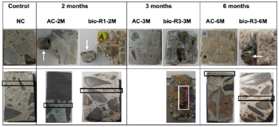 The severity of acid corrosion is influenced by time, as illustrated in Figure 4. The samples exposed to acid environments for 3–6 months (AC-3M and AC-6M) were highly corroded compared to those that were exposed for two months or the control (NC) [19]. The phenomenon illustrates there was a positive and definite relationship between the frequency of acid exposure and the durability of concrete structures [19]. Additionally, there were slight differences depending on whether the concrete specimens were exposed to biogenic (bio) or abiotic sulfuric acid; corrosion was most pronounced in the former case.