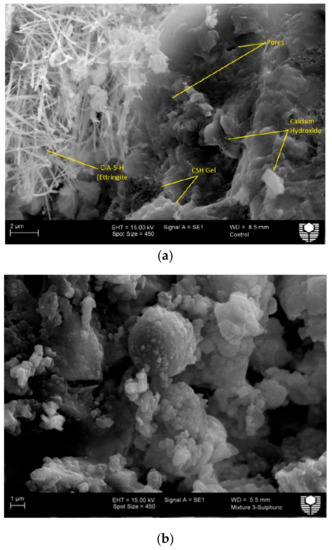 Inorganic acids have a similar effect on the structural integrity of acidic structures. The impact of the acid attacks on the surface and cross-sectional morphology of the cement microstructure is visualized in the scanning electron micrographs in Figure 5a,b [15]. The decline in strength was proportional to the duration of exposure to acidic environments, as shown in Table 5. The compressive strength of the control (ordinary pozzolanic cement decreased from 29.4 MPa to 21.23 MPa after 90 days of exposure to nitric acid), as shown in Table 6. The data shows that mass losses increased consistently in acidic environments. Cement additive ratios (ultra-fine fly ash (UFFA) and fly ash (FA)) impact the mass losses. The least mass losses and reduction in compressive strength were reported in 50% FA + 10% UFFA—a phenomenon that underscores the importance of supplementary cementitious material on the durability of concrete structures exposed to acidic environments.
