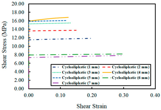 Various adhesives have been developed to augment the durability of the concrete structure, including epoxy-cement paste, which is made of epoxies such as bisphenol A and resins such as modified cycloaliphatic amine and modified aliphatic and aromatic amines [31,32]. The epoxy paste forms a robust bond with cement via silane surface functionalization (mechanical interlocking and hydrogen bonding); the net effect is better functionality of the material and resistance to moisture [32]. Similar observations were made by Yeong and co-researchers. However, the strength of the bond was influenced by the thickness of the epoxy, especially in the development of the shear strength of the concrete structure [31]. In addition, the effectiveness of the epoxy resin was also influenced by temperatures. Considering that the adhesives have limited thermal stability, elevated temperatures (>65 oC) diminish the mechanical strength of the epoxy resins by up to 90% [33]. The effectiveness of the adhesive was dependent on the ratios of the hardening agent and the resin, as shown in Figure 7. The thickness of the layers deposited varied between 1 mm and 3 mm. The epoxy resin with aromatic amines with a thickness of 4 mm exhibited the highest resistance against shear strain. In contrast, epoxy resins with a thickness of 7 mm exhibited the highest resistance against shear stress [34]. Apart from reinforcing bonds in concrete structures, adhesives are also used in steel structures using a similar mechanism as concrete applications.