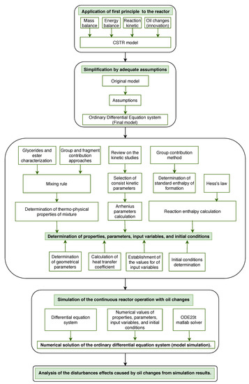 The aim of this work is to develop an analysis of the effects caused by oil changes in a continuous stirred-tank reactor during the continuous and steady state operation of the system. To achieve this purpose, a mathematical model for the reactor that considers the changes of the oil type in the feed stream was developed. In this work, a methodology to model the oil changes is proposed. The flow diagram presented in Figure 1 summarizes the general methodology used in the course of the investigation. First, an equation system that describes the dynamics of mass and energy into an industrial continuous stirred-tank reactor [3] was development. Typical modeling methods to develop first principle models for chemical system, mass and energy balances, were employed [37,38]. These techniques have been widely used for modeling of biodiesel production systems [3,4,12,16,18,19,39,40]. The dynamics of oil changes, which had not been considered previously in the literature, were modeled in this work. Then, the original equation system was simplified adopting adequate assumptions that are close to the operating condition in the reactor. The final model consists of a set of ordinary differential equations. Next, the physical and chemical properties of the system, model parameters, value for input variables and initial conditions for the model were determined to carry out the model simulation. Then, the ordinary differential equation system was solved in a computer using Matlab software (Model simulation) (version 2016a, MathWorks, Natick, MA, USA). Finally, the simulation results were used to analyze the effects caused by oil changes disturbances. The following subsections present a more detailed description of the important aspects in the methodology for the model construction.
