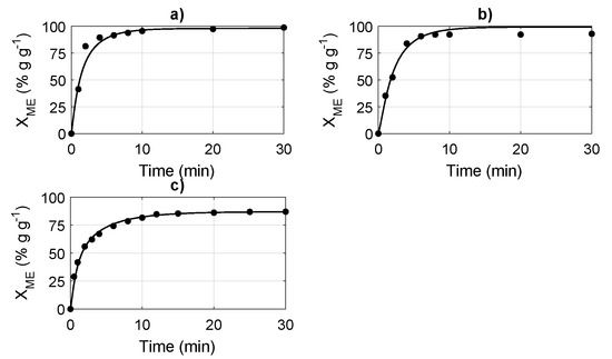The transesterification reaction rate is not only defined by the kinetics of the reactions, but by three regimes: an initial mass transfer-controlled regime (slow); a kinetically-controlled regime (fast); and a final regime occurring as equilibrium approaches (slow) [26]. The initial mass transfer regime is associated with the time that the triglyceride molecule spends in moving into the methanol phase and colliding with the methanol molecule [42], although an adequate mixing intensity minimizes the effects of the mass transfer. For example, various studies have demonstrated that the mass transfer region becomes insignificant (at approximately one minute), with, at laboratory scale, the impeller rotating at an intensity of 600 rpm [26,42,43,44]; meanwhile, high reaction temperatures (50–65 C) also reduce the mass transfer period due to the increased solubility of the oil in the methanol [26]. The present study does not focus on the mass transfer regime, assuming an adequate agitation and a high reaction temperature (60 C); therefore, the transesterification rate can be modeled via the reaction rate equations in the form of Equation (5).