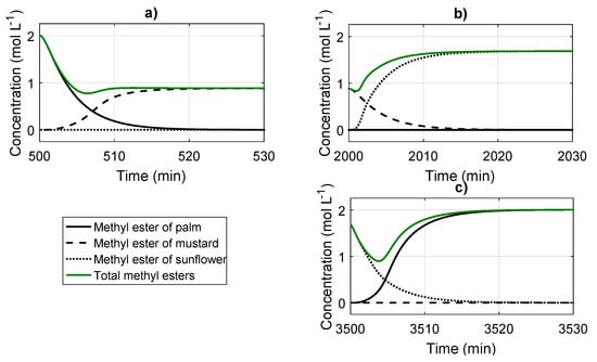 Figure 4 shows the behavior of the ester concentrations after the oil changes, omitting the first transitional period when the state of the system moves from initial conditions to its first steady state. After a feed oil change, the esters from the previous oil begin to decrease due to the interrupted glyceride supply, while, in contrast, the esters from the new oil begin to be formed. As the rate at which the first esters leave the tank is higher than the formation rate of the new esters, a decrease in the total quantity of esters is observed after the feed oil changes (green curve), with the highest concentration in the new post-change steady state obtained with palm oil.