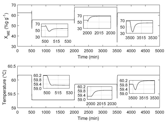 Although the mixture temperature is also disturbed after each feed oil change, its variations are not significant, in contrast to what was previously observed for ester mass fraction. This is because the enthalpy of the reactions for different oils are practically identical. Although the temperature also depends on reaction rates (see Equation (24)), the differences between oils seem not to have an important influence on the temperature. The magnitude of temperature variations, in the worst-case scenario, was only 1.48%. Table 4 summarizes the results of the operational disturbances in the reactor.
